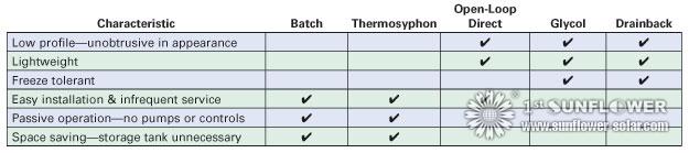 Os vencedores provados são simples, confiável e duradoura. Alguns sistemas são "malha aberta" (a água doméstica em si é diretamente aquecido) e alguns são "circuito fechado" (um fluido de transferência de calor é aquecido pelo colector eo calor é transferido para a água quente sanitária por meio de um calor permutador). Alguns sistemas são "ativos", o uso de peças móveis, tais como bombas e válvulas, e outros são "passiva", sem uso de peças mecânicas ou em movimento.